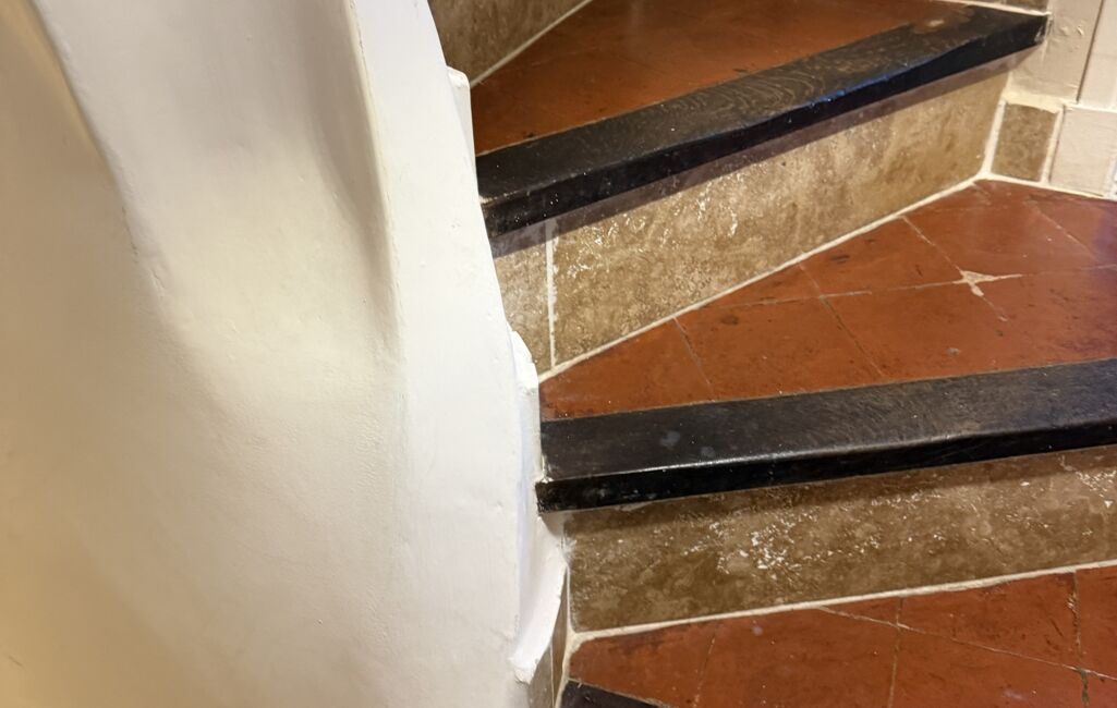 Les escaliers intérieurs en tommettes d’origine soulignent l’authenticité des lieux.