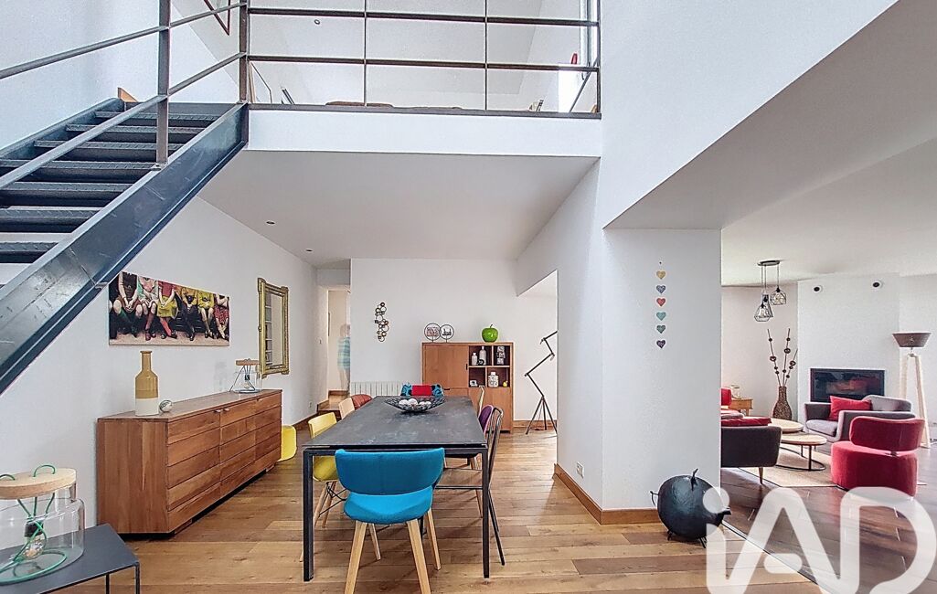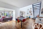 On accède à l'étage de cette maison par un large escalier en métal où la hauteur de plafond laisse place à de vastes volumes et de la lumière. Une mezzanine pouvant accueillir un 2ème espace salon-bibliothèque, 2 autres chambres de 14 et 15m2, chacune avec leurs salles d'eau attenantes, un wc et un espace grenier complètent l'étage.