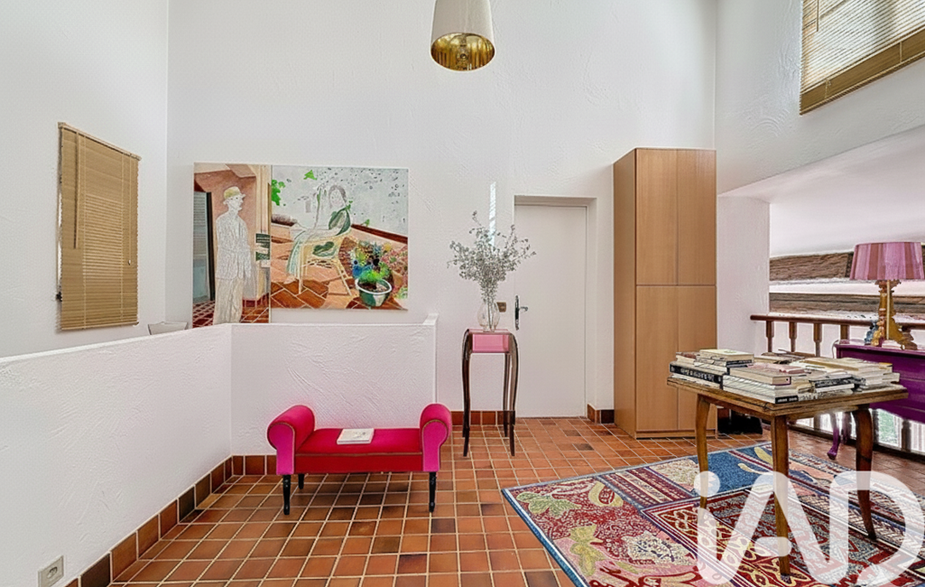 - Un vaste salon avec cheminée, sublimé par une impressionnante hauteur sous plafond, offrant un volume remarquable et une atmosphère chaleureuse