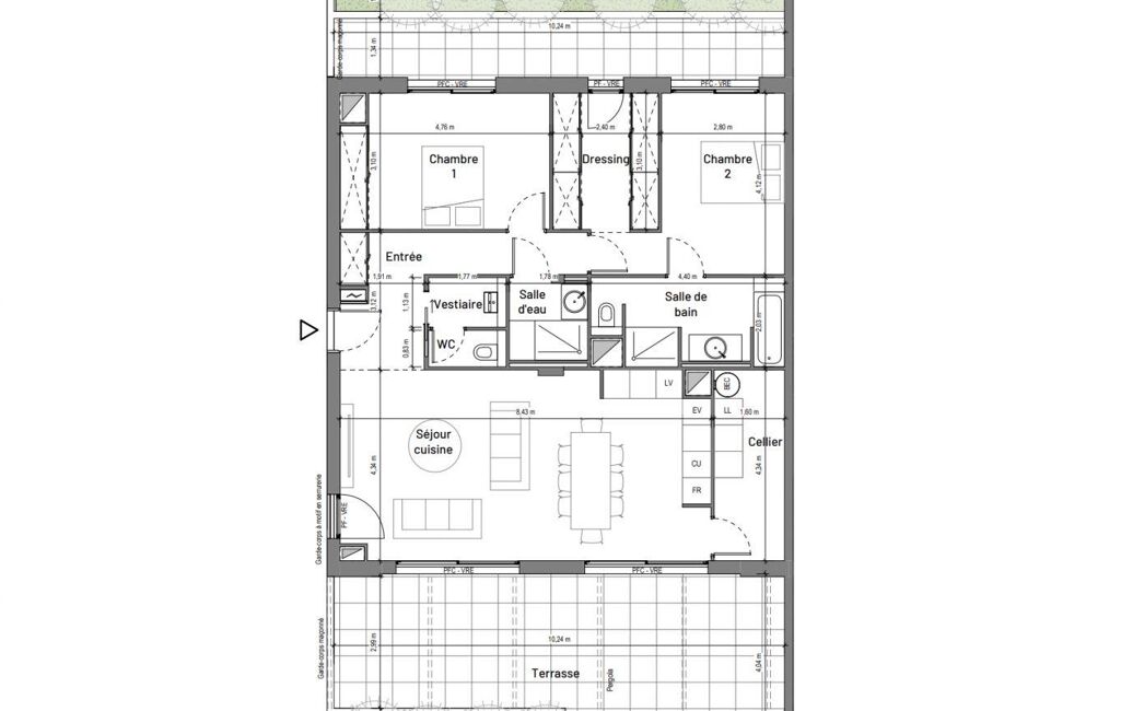 L’appartement s’ouvre sur une vaste pièce de vie avec séjour et cuisine ouverte de 35,7 m² environ, baignée de lumière grâce à sa triple exposition. Cet espace convivial donne accès à une grande terrasse de 35,5 m² environ, idéale pour profiter pleinement des extérieurs.