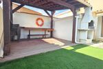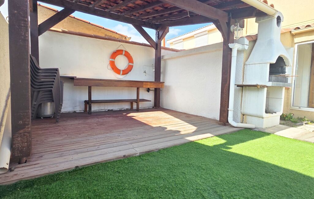 Côté jardin entièrement fini en gazon synthétique avec une pergola en bois pour coin cuisine d'été extérieur, une piscine de 6 par 3 en coque, sur le devant on peut entrer 2 véhicules.