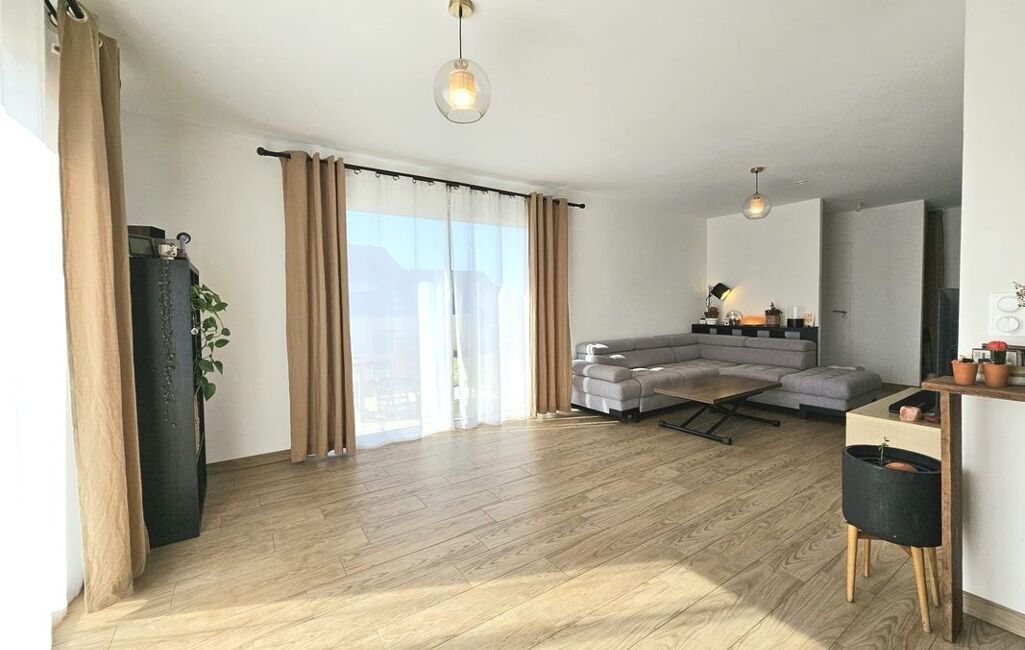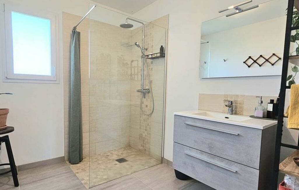 Belle maison de plain-pied avec jardin, offrant une pièce de vie spacieuse et lumineuse, 3 chambres, un cellier, une salle de bains et des WC séparés.
