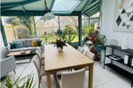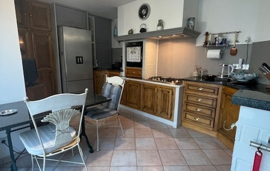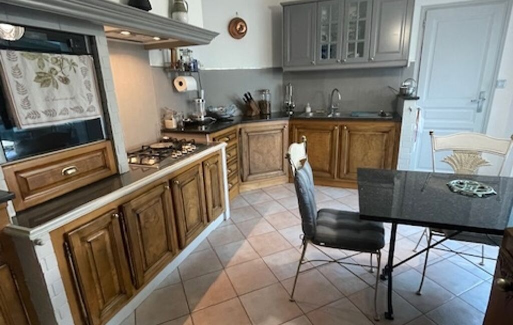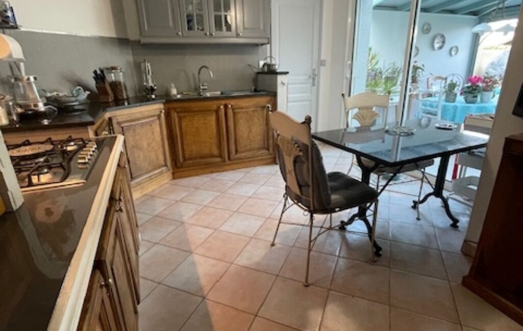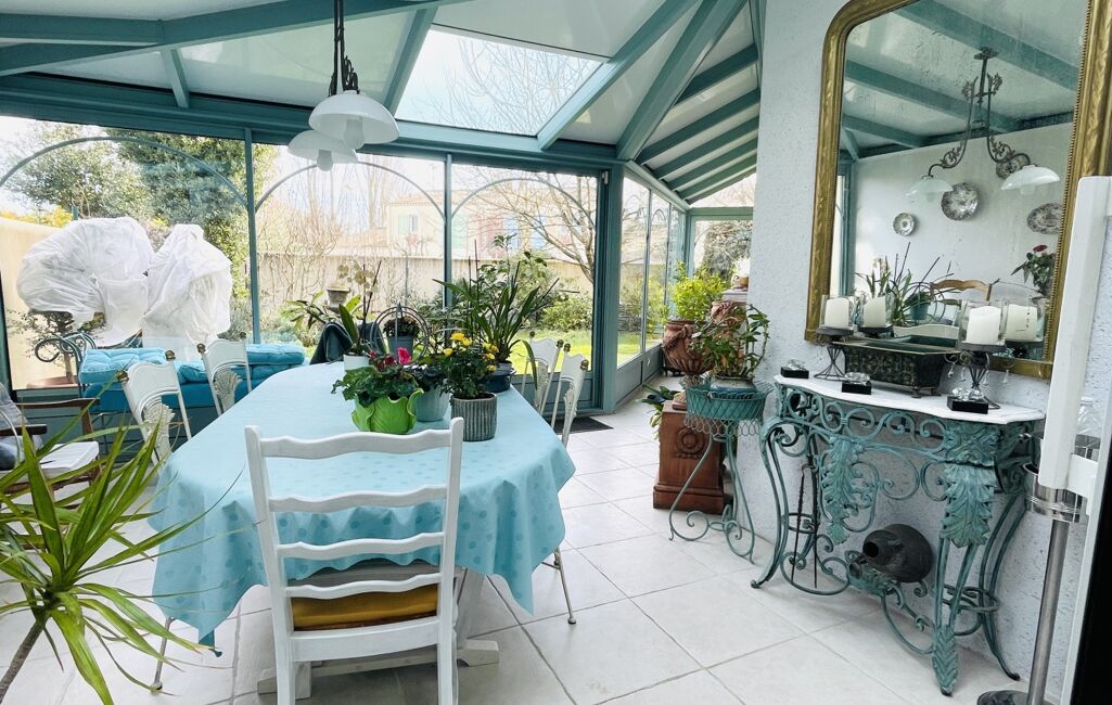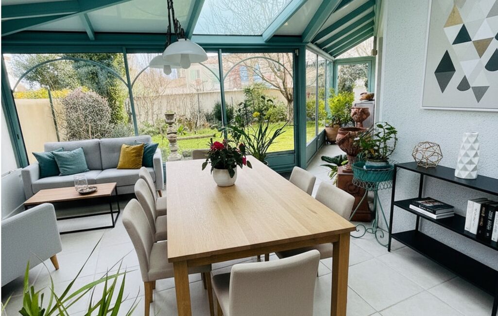 La cuisine équipée est attenante à une véranda chauffée, ouverte également sur le salon, idéale pour profiter de l’espace toute l’année.