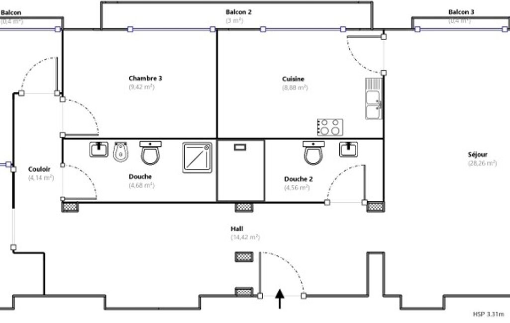 L’appartement offre une répartition fonctionnelle avec une vraie entrée, séparant l’espace de vie de l’espace nuit.