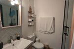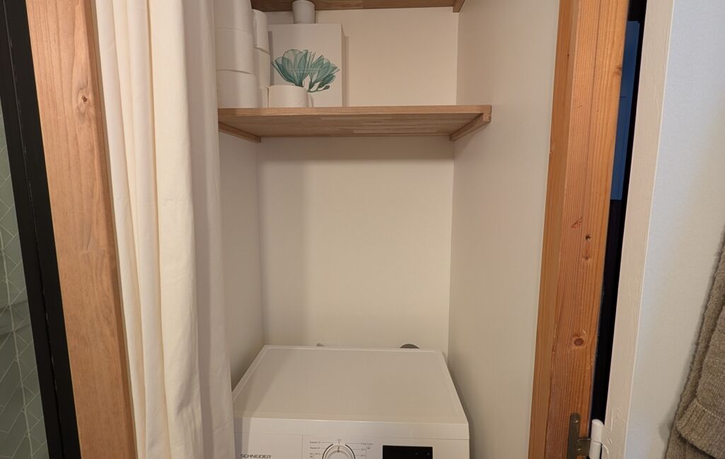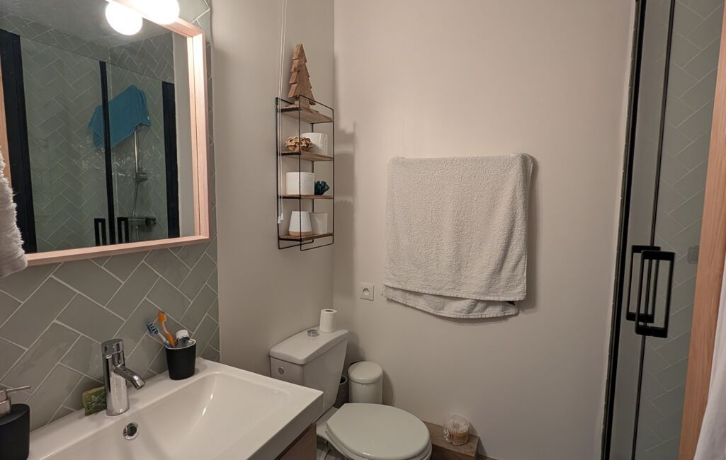 Salle d’eau neuve avec douche à l’italienne, meuble vasque, WC, sèche serviettes et lave-linge neuf intégré