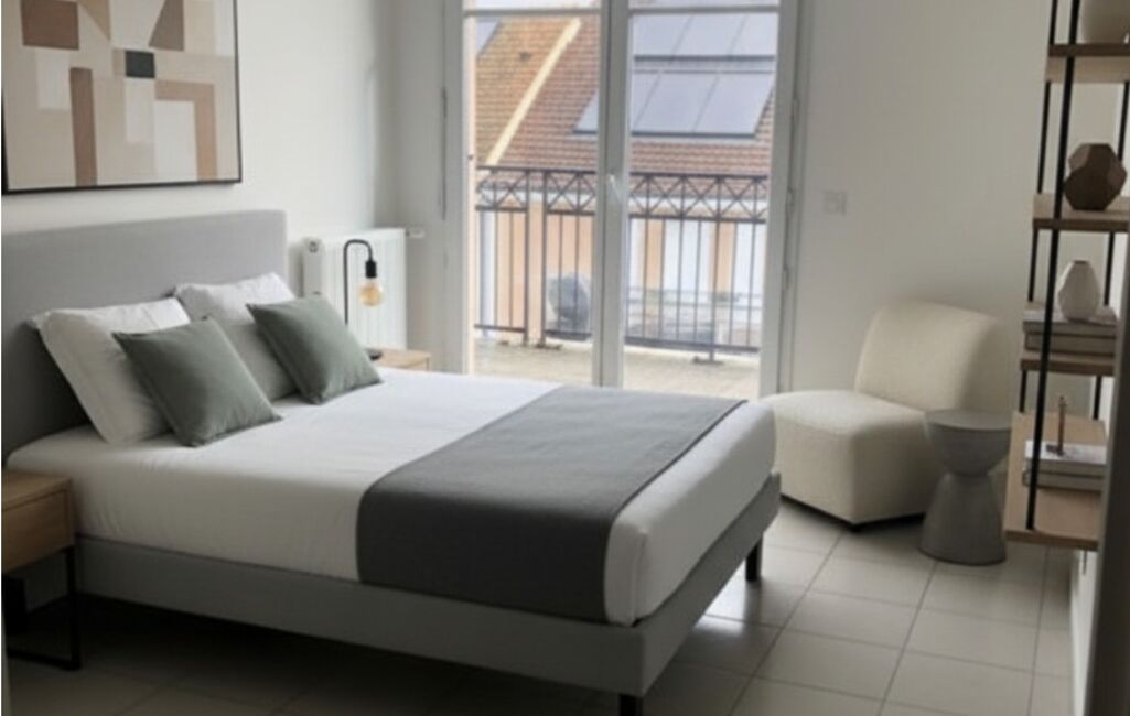 Un salon séjour lumineux donnant accès à un balcon