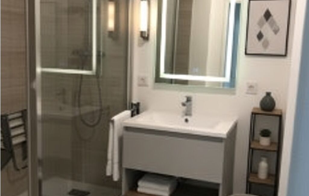 Une salle d'eau avec une grande douche, meuble vasque et WC.