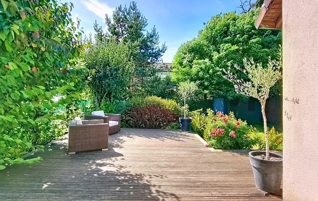À l’extérieur, vous profiterez d’un jardin paysager de 603 m², véritable havre de paix pour les enfants et les moments de détente. La terrasse spacieuse, parfaitement exposée sud et ouest, garantit un ensoleillement optimal tout au long de la journée, idéal pour les repas en plein air et les soirées d’été.