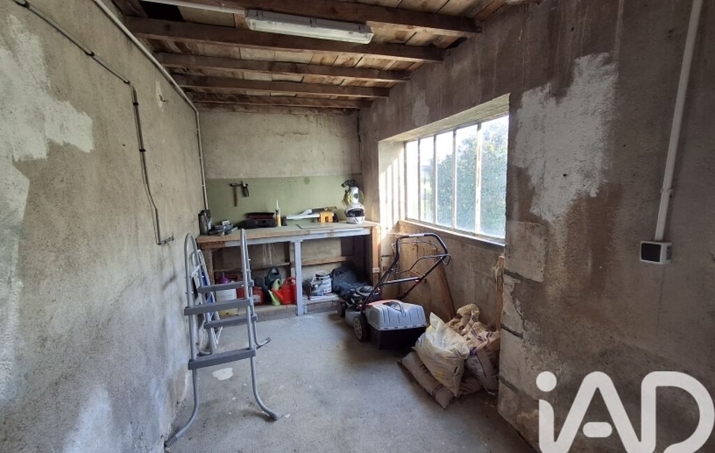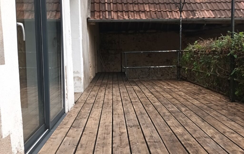 Terrasse bois surélevée côté jardin, cave partielle voûtée, atelier, remise et un grand hangar en pierre de 50 m2.