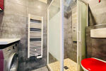 Une salle d'eau avec douche, WC et une machine à laver