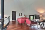 Une belle mezzanine accueille un espace bureau chaleureux.
