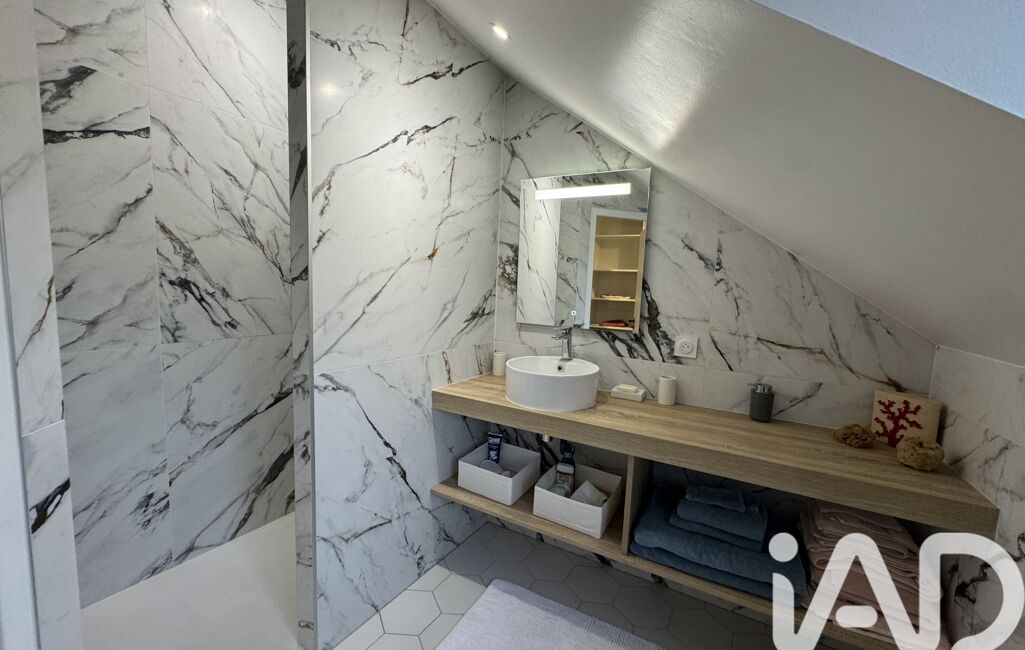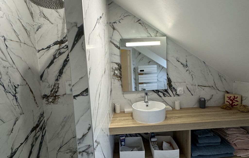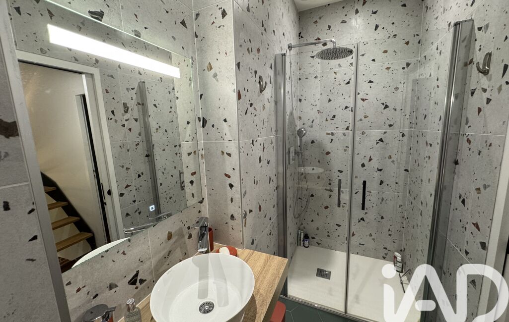 À l'étage : sur parquet massif, deux chambres lumineuses avec dressing, bureau et rangements aménagés sur mesure, une salle d'eau en terrazzo avec wc suspendu ,
