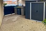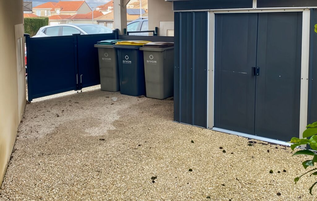 A l'extérieur, une dalle a été aménagée sur le côté de la maison pour accueillir le cabanon, procurant de l'espace supplémentaire. 2 portillons fermant à clés permettent le passage dans le jardin.
