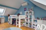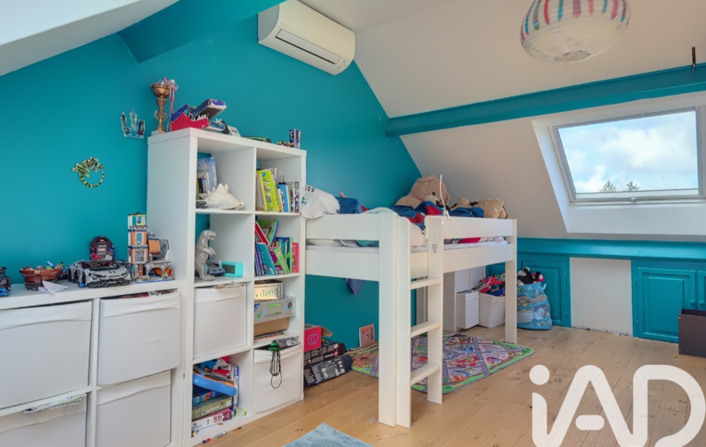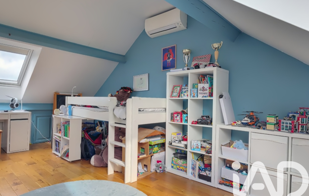 À l’étage, un palier pouvant faire office de bureau ou de bibliothèque dessert deux chambres supplémentaires ainsi qu’une salle de bain avec WC.