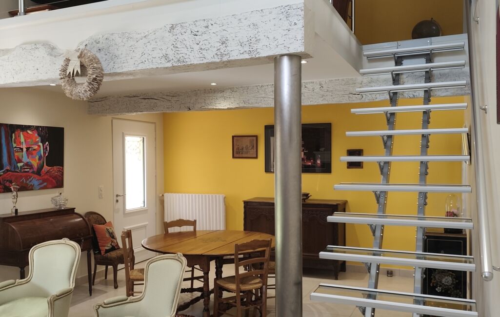 Le rez-de-chaussée accueille un magnifique séjour avec cheminée ainsi qu'un trés bel escalier en verre, son plafond cathédrale et mezzanine, un second salon séjour permettant des réunions familiales ou amicales, cuisine équipée ouvrant sur terrasse, une partie nuit dessert deux chambres, une salle d'eau , wc, une buanderie ,une cave et un atelier complètent ce niveau.