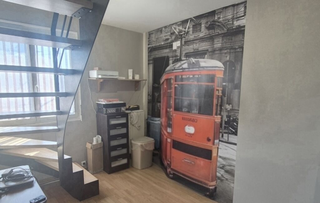 À l’étage, le palier dessert deux chambres confortables, une spacieuse salle d’eau avec WC, et un bureau doté d’un élégant escalier métal et bois menant au dernier niveau.