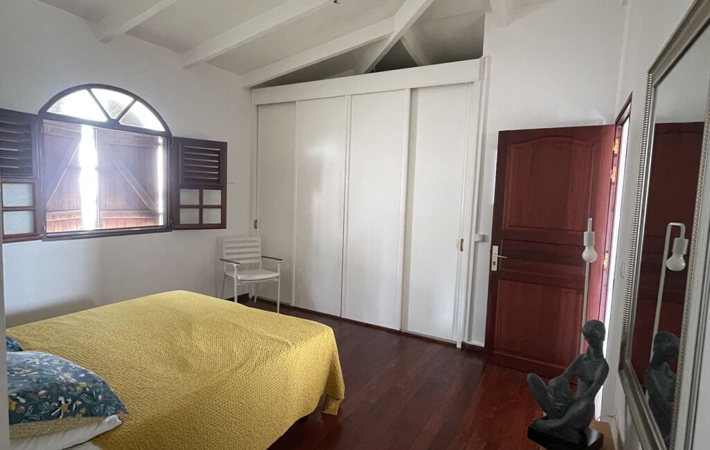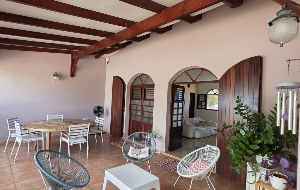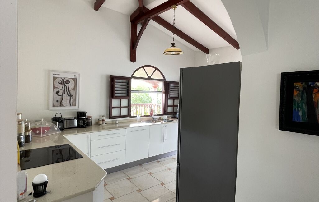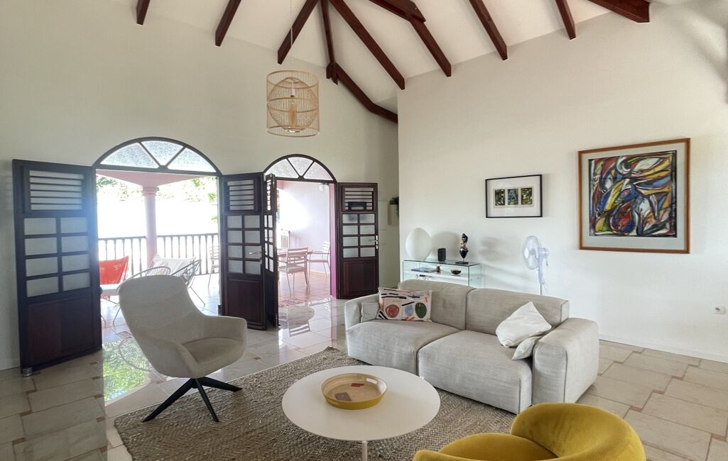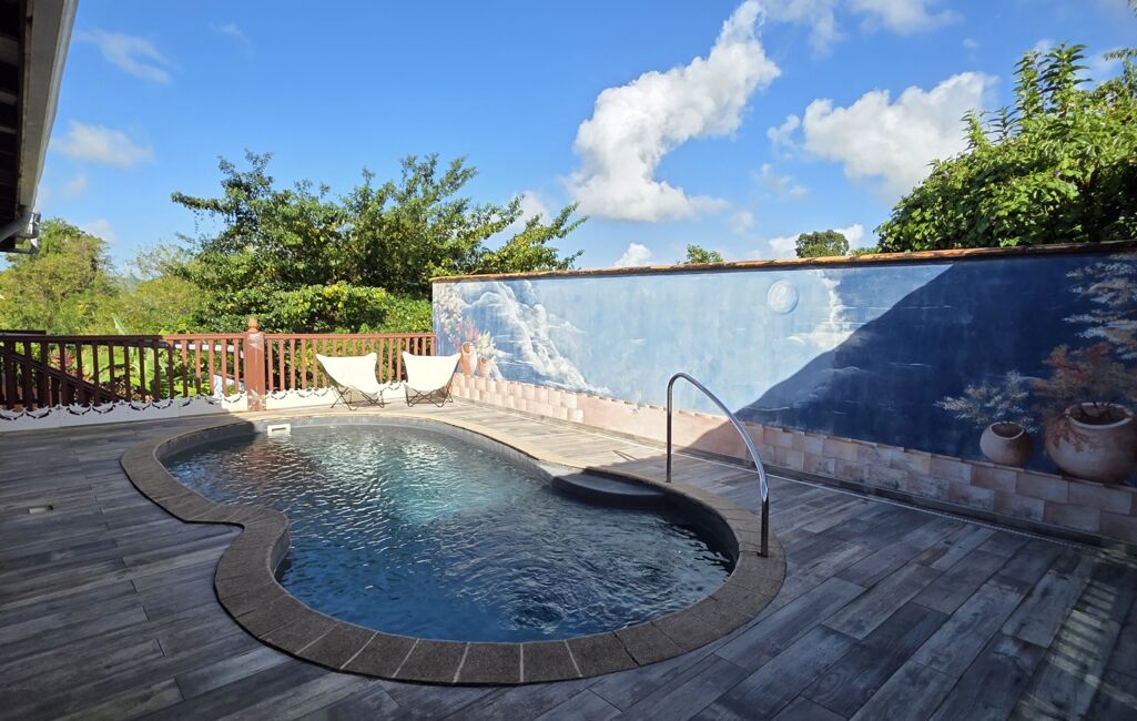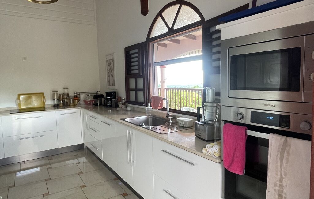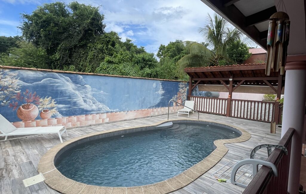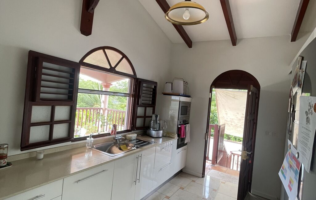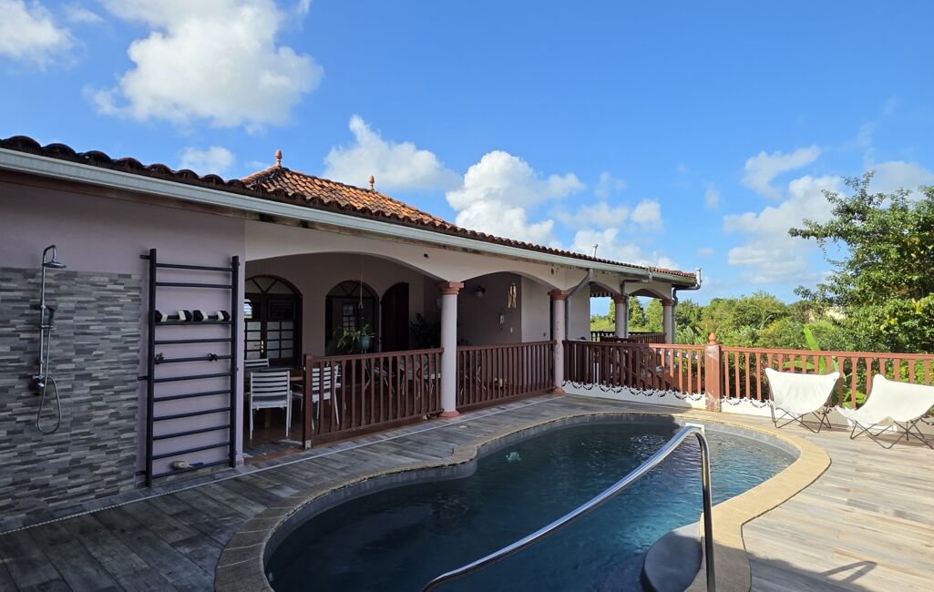 iad France - Sylvie Nathie vous propose: Secteur cité scolaire de RAMA Solide villa avec vue sur la Mer et le Rocher du Diamant - d'environ 120 m2 + 43 m2 de terrasses couvertes avec une toiture en tuiles, sous sol total, 1000m2 de terrain composée comme ceci, entrée sur la salle, une cuisine aménagée et équipée de qualité et quasi neuve, 2 chambres, 1 salle d’eau, 1 wc, 1 suite parentale - 1 piscine au sel , au sous sol - 1 chambre avec salle d’eau et wc, une cuisine , 1 atelier - récupérateur d'eau - portail électrique - Alarme - moustiquaires sur toutes les fenêtres - arbres fruitiers. A quelques minutes des plages de Sainte Luce et de la Nationale - A très vite pour une visite