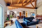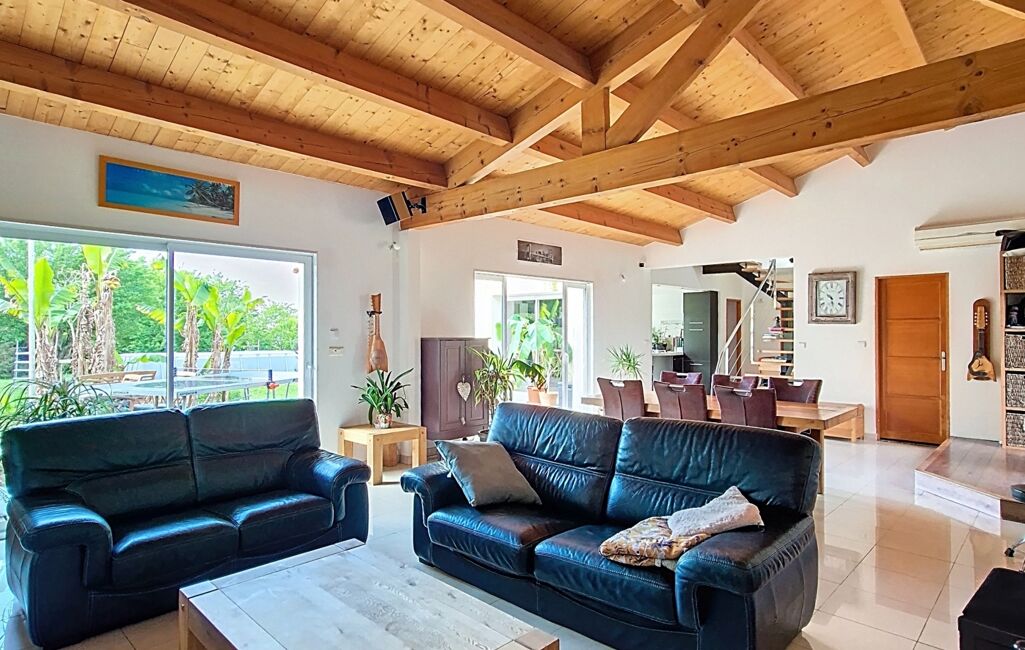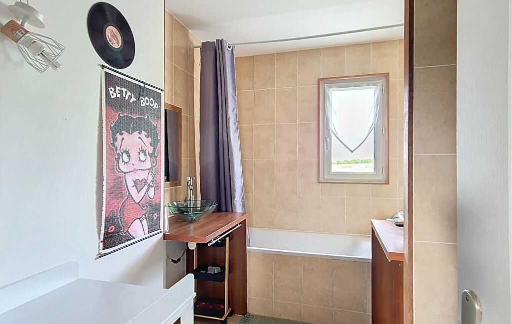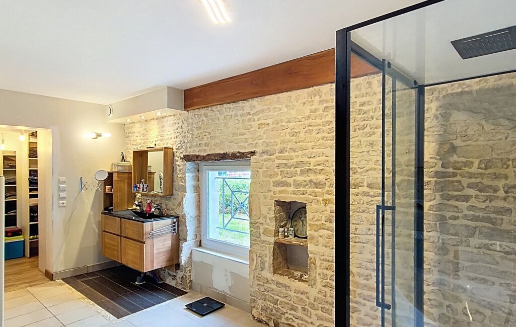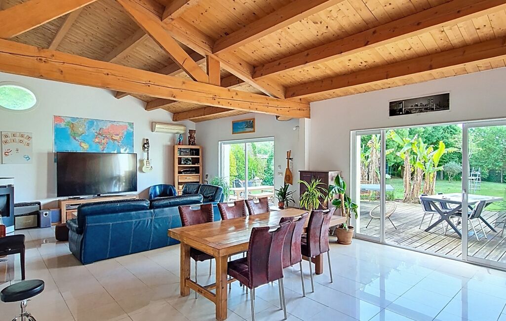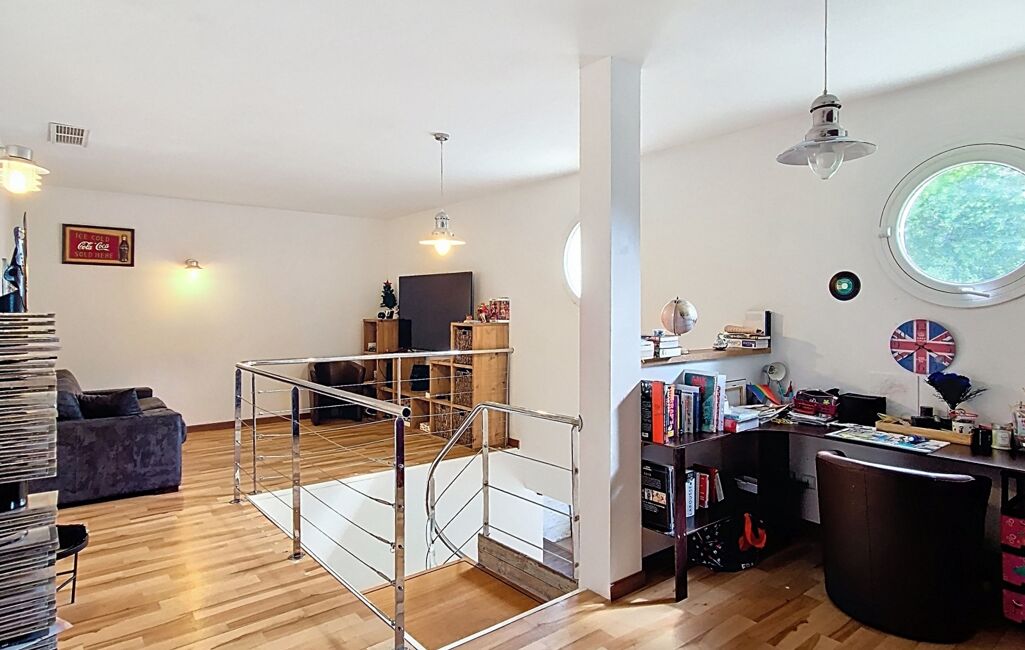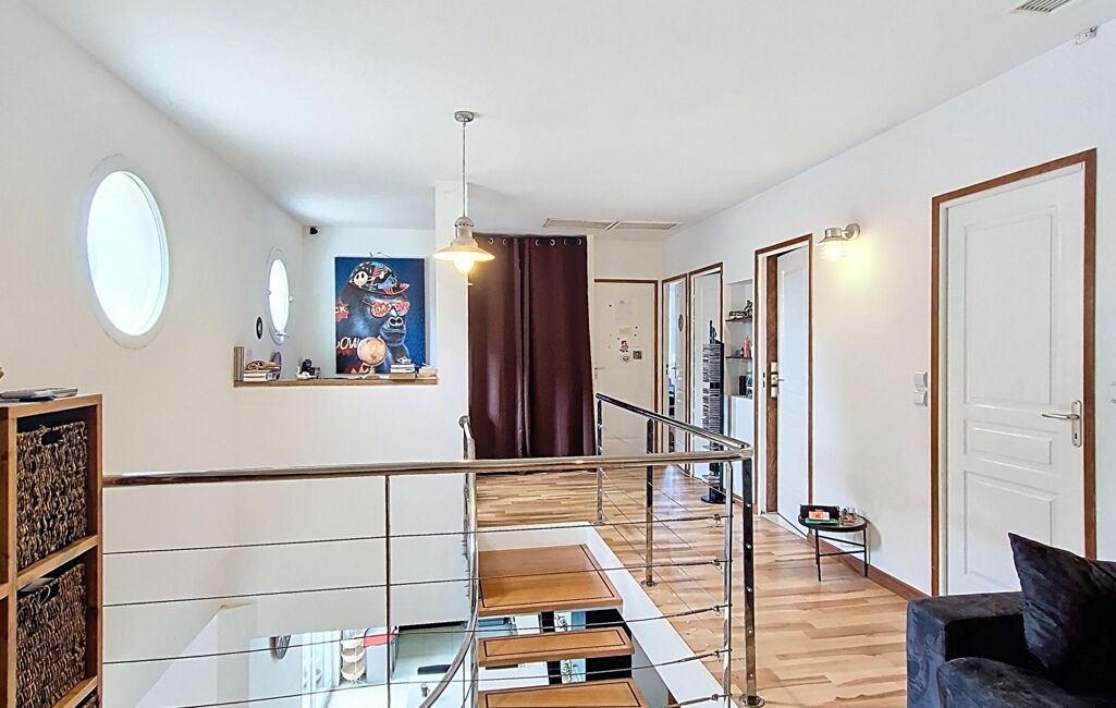 Dès l’entrée, vous serez séduits par la luminosité et les volumes impressionnants de la pièce de vie, sublimée par sa charpente apparente et son poêle à granulés récent, créant une ambiance chaleureuse et conviviale. La cuisine ouverte, moderne et parfaitement équipée, bénéficie d’un accès direct à la terrasse. Un cellier attenant facilite le quotidien, menant directement au garage spacieux de 40 m² avec galetas, espace buanderie et porte sectionnelle motorisée.