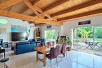 Le confort est assuré toute l’année grâce à une pompe à chaleur air/air (splits dans la pièce de vie et gainable réparti à l’étage et dans les chambres), complétée par le poêle à granulés. Huisseries PVC double vitrage, baie à galandage aluminium et volets roulants électriques renforcent les prestations.