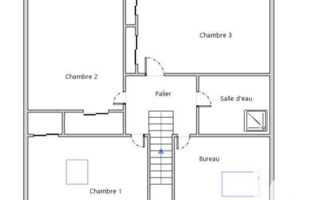 * A l'étage : un palier distribue 3 chambres avec placards, une salle d'eau avec douche et WC, un bureau.
