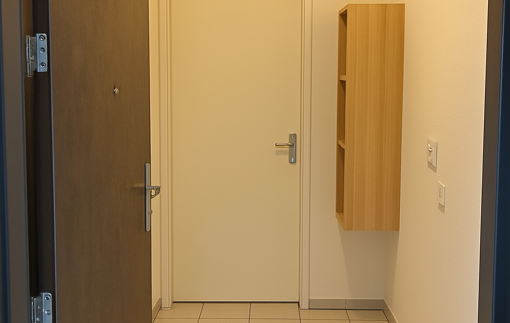 L'espace de vie principal comprend une salle de bain moderne et une kitchenette équipée, parfaitement agencée pour optimiser l'espace. La pièce principale peut facilement être aménagée en espace de vie et chambre à coucher. L'exposition ouest apporte une luminosité agréable tout au long de la journée.