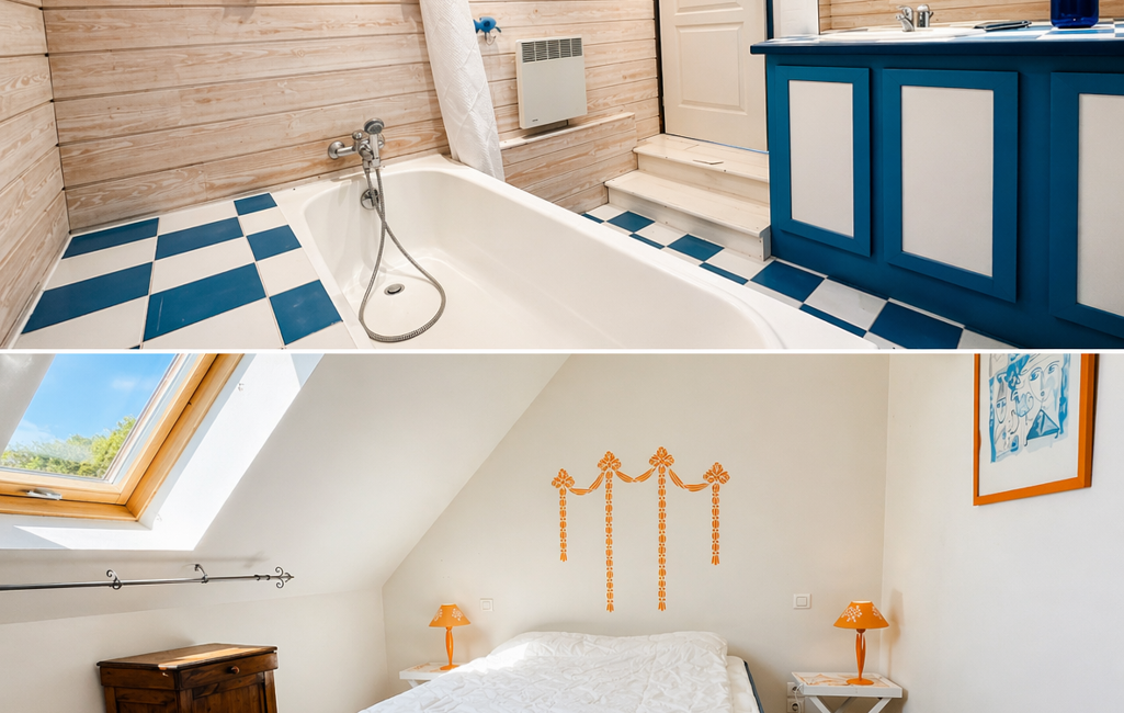 Les pièces d’eau, réparties dans la maison, proposent de beaux volumes avec baignoires et espaces confortables, pensées pour le bien-être au quotidien.