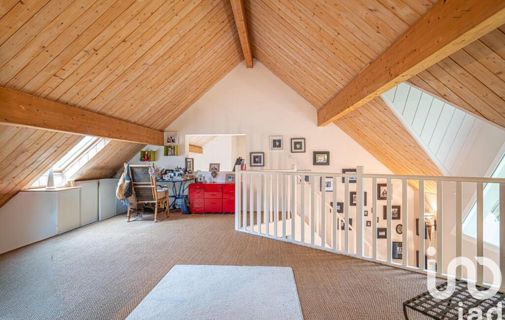 À l’étage, les poutres apparentes apportent une touche de caractère à la spacieuse mezzanine, parfaite pour un bureau ou un coin détente. Deux autres chambres et une salle de bains complètent ce niveau.