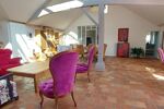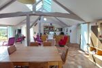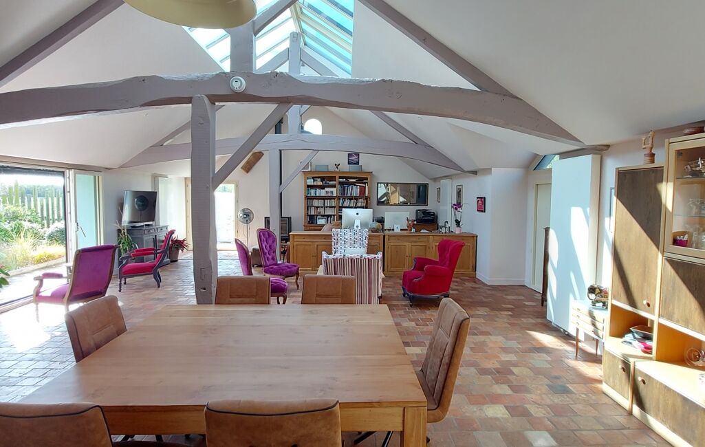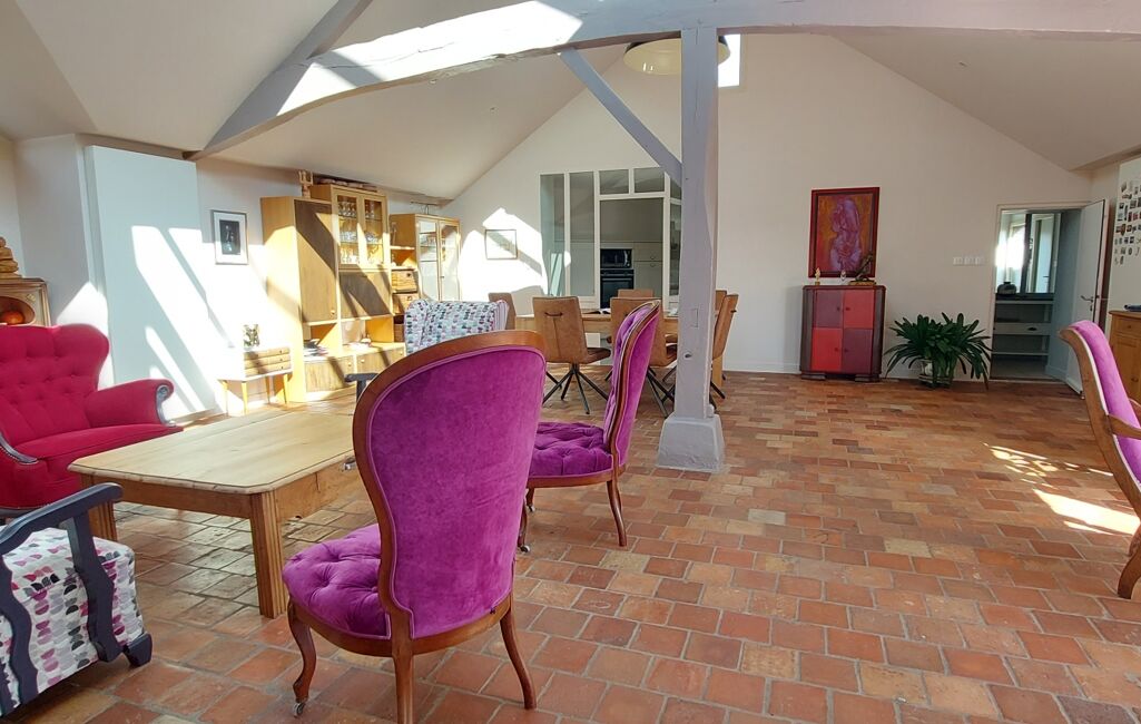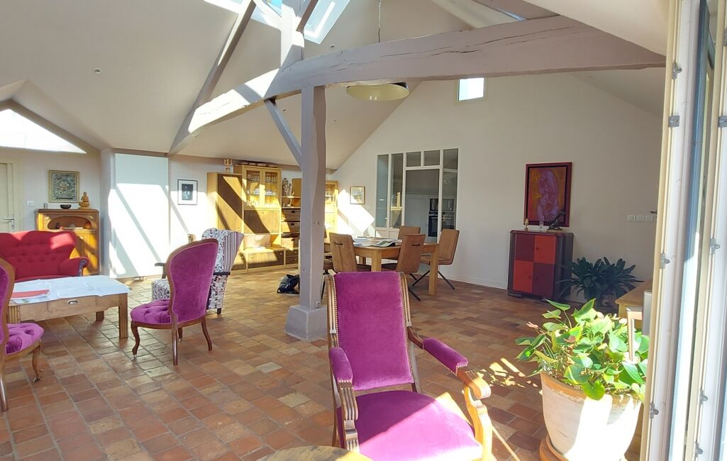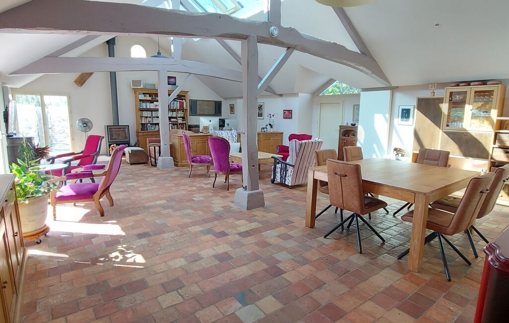 •Une vaste pièce de vie lumineuse, ornée de tommettes d'origine, sublimée par une grande baie vitrée, une élégante verrière et des poutres apparentes