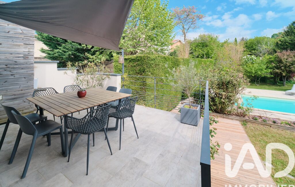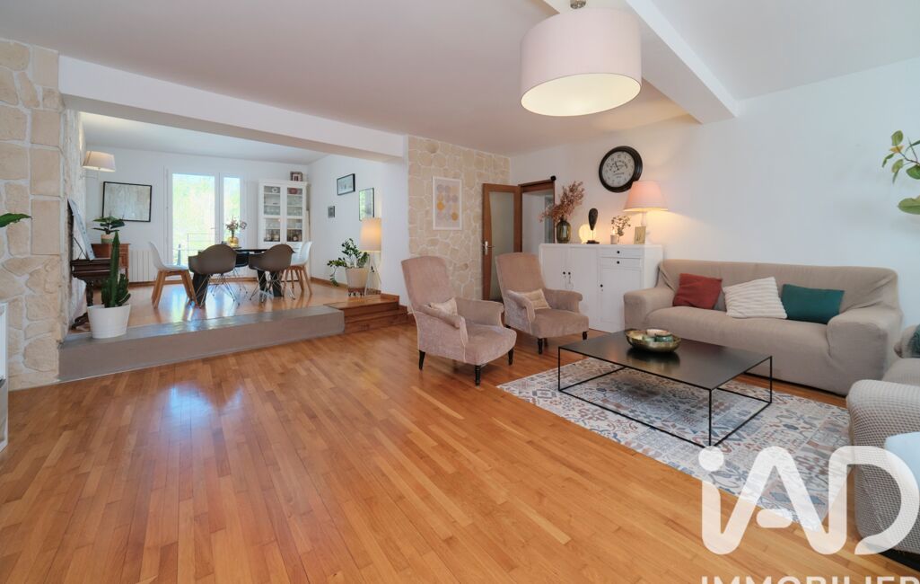 On emprunte l'escalier et on est subjugués par la découverte des pièces de vie: 75m² s'offrent à nous dévoilant cuisine ouverte, séjour, et salle à manger. La démarcation des espaces est faite par l'agencement du parquet et des matières brutes telles que la pierre au mur ou le béton, les jeux de niveaux, et les peintures. Les coloris chauds, la lumière extérieure, le poêle à bois contribuent à l'âme chaleureuse de la pièce. La salle à manger nous révèle, quant à elle, la terrasse de 21m² qui surplombe un jardin insoupçonné avec piscine.