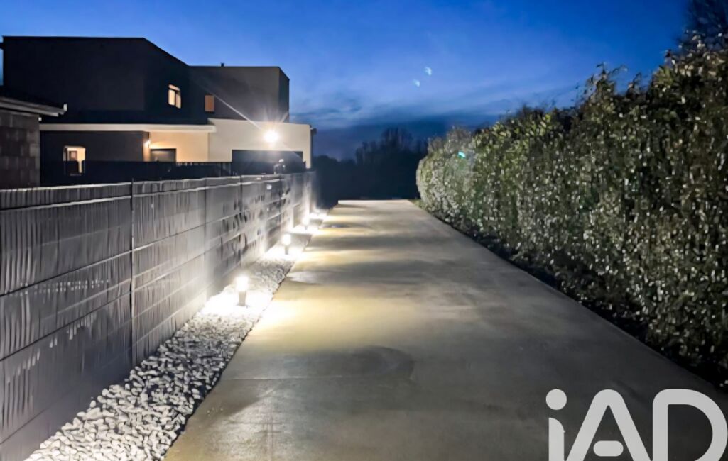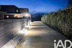 L’accès s’effectue par un portail électrique contemporain, prolongé par une longue allée privée en béton, mise en valeur par des plots lumineux et un massif minéral aux lignes épurées, où chaque détail a été pensé.
