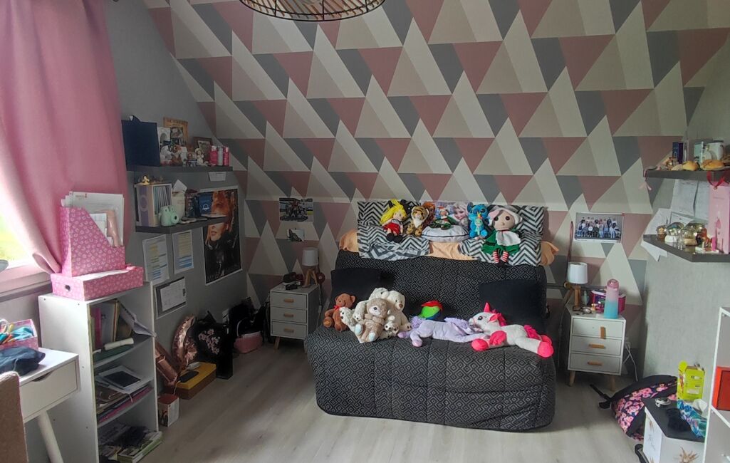 À l’étage, un palier dessert deux chambres ainsi qu’une salle de douches.