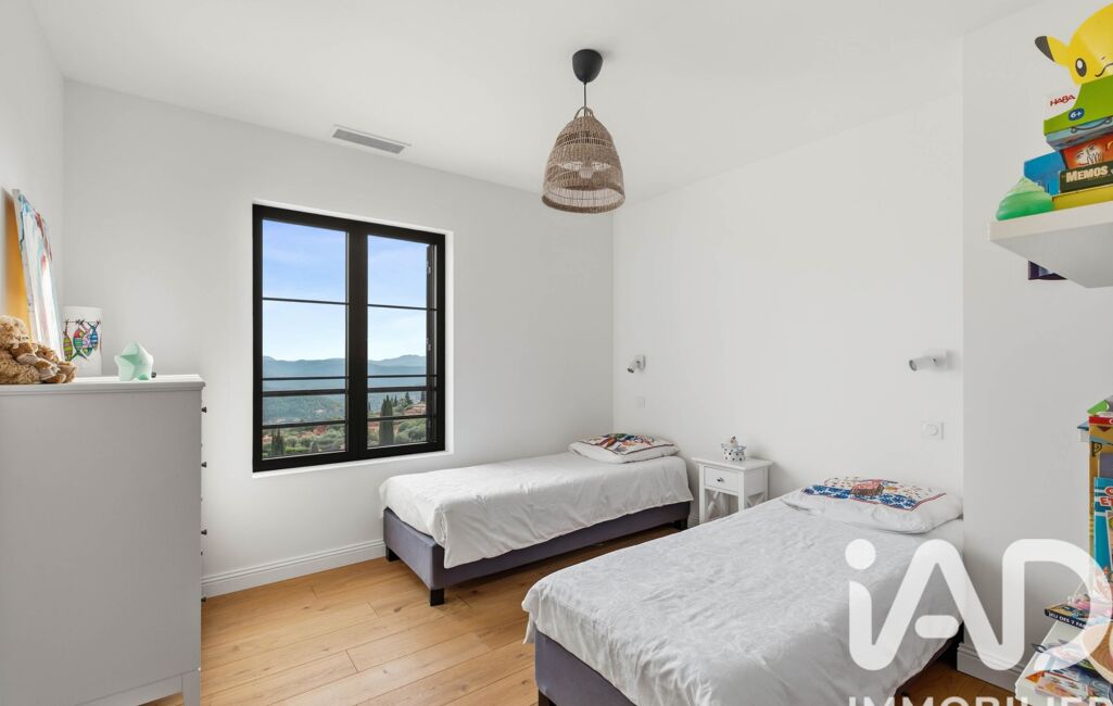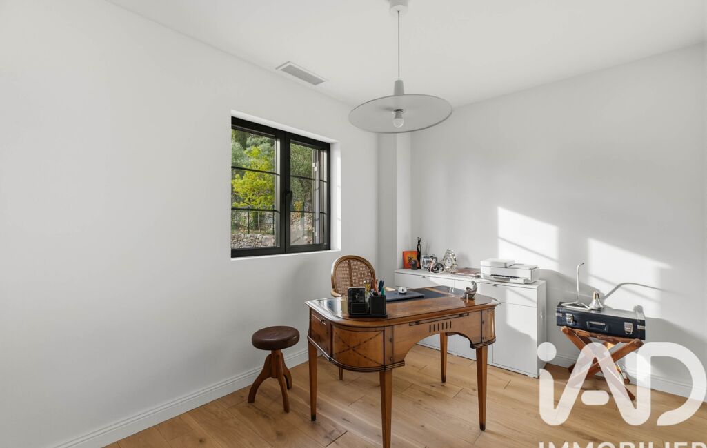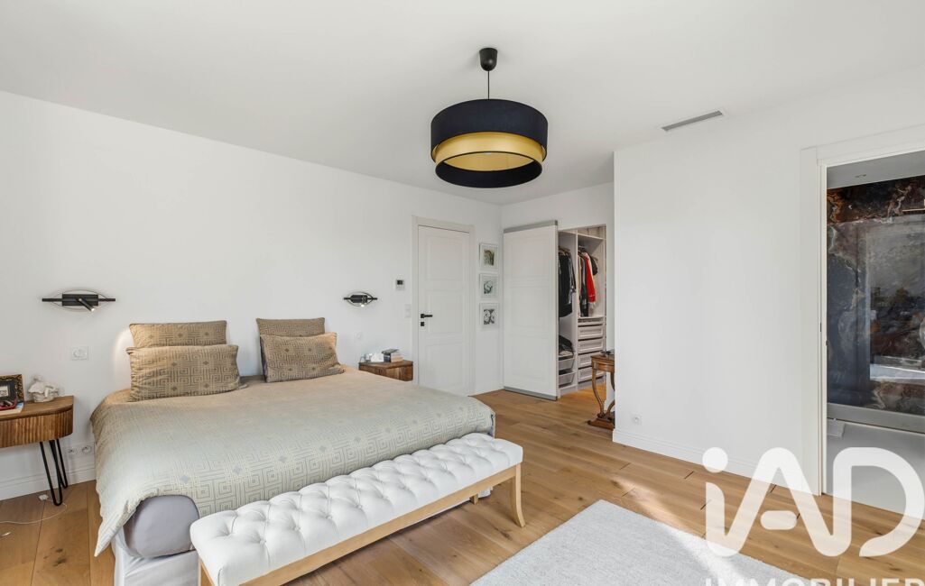 À l’étage, un bureau et deux suites avec salles d’eau privatives accueillent les occupants, dont une suite parentale avec dressing, accès à un large balcon ensoleillé et une vue époustouflante. Les portes à galandage, les matériaux nobles et les volumes parfaitement maîtrisés créent une atmosphère sereine et raffinée.
