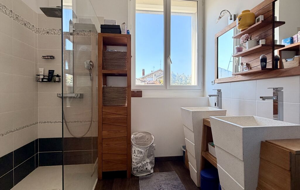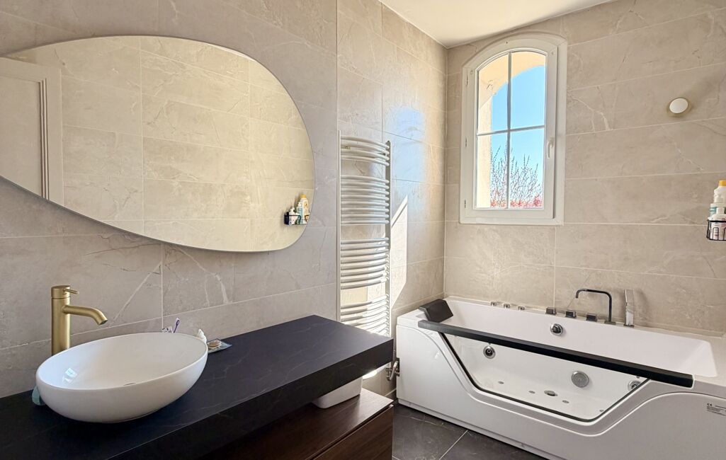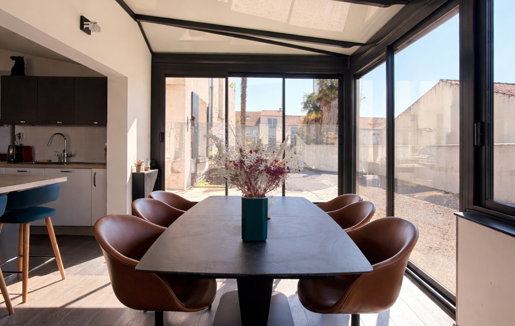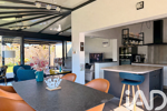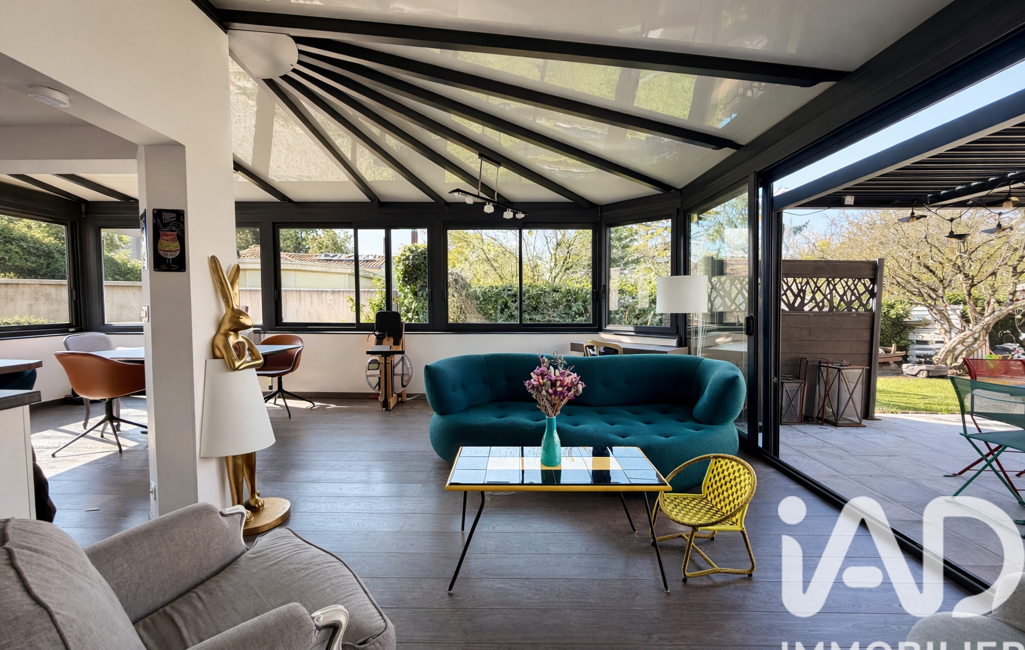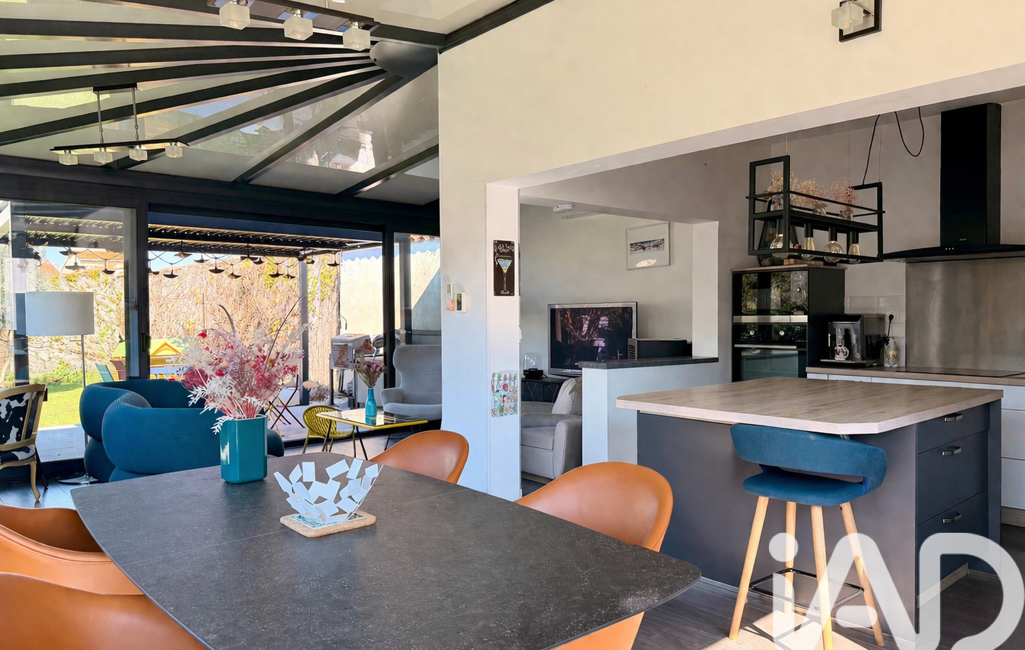 Dès l’entrée, le ton est donné : matériaux de qualité, volumes généreux et lumière omniprésente. La pièce de vie s’ouvre sur une magnifique extension vitrée, véritable signature du bien, offrant une triple exposition sud, ouest et nord. Cette configuration crée une sensation de dedans-dehors exceptionnelle et met en valeur le jardin à chaque instant de la journée.