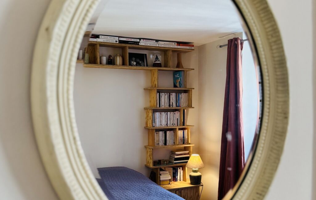Au même niveau, un espace nuit offre une chambre rénovée avec coin bureau, une salle d’eau, et un toilettes invités.