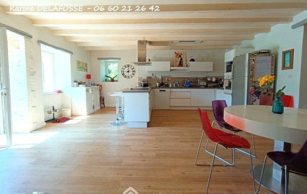 La maison se compose de vastes pièces de vie (+ de 100 m² en tout) au rez-de-chaussée : une cuisine d'environ 34 m² aménagée équipée, un salon de près de 40 m² avec une belle cheminée foyer ouvert équipé d'un système de soufflerie d'air chaud, une salle à manger d'environ 29 m² donnant sur la terrasse exposée ouest à l'abri des regards, accédant au beau jardin verdoyant, une chambre parentale d'environ 19 m² avec salle d'eau, un bureau/espace ouvert de 15 m² environ, une salle de bain avec buanderie d'environ 13 m², un wc indépendant.