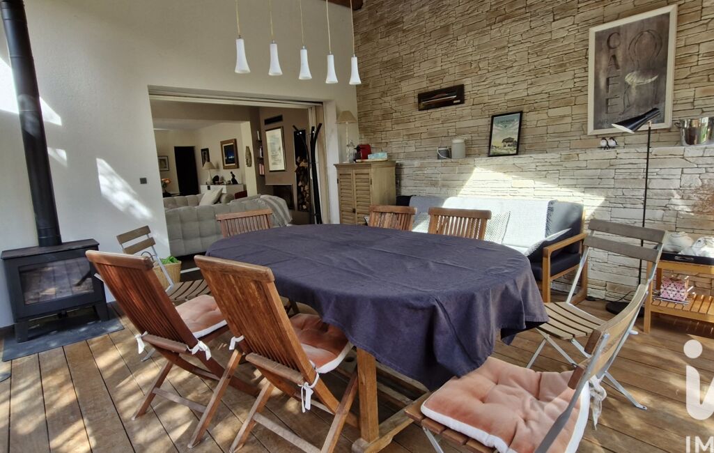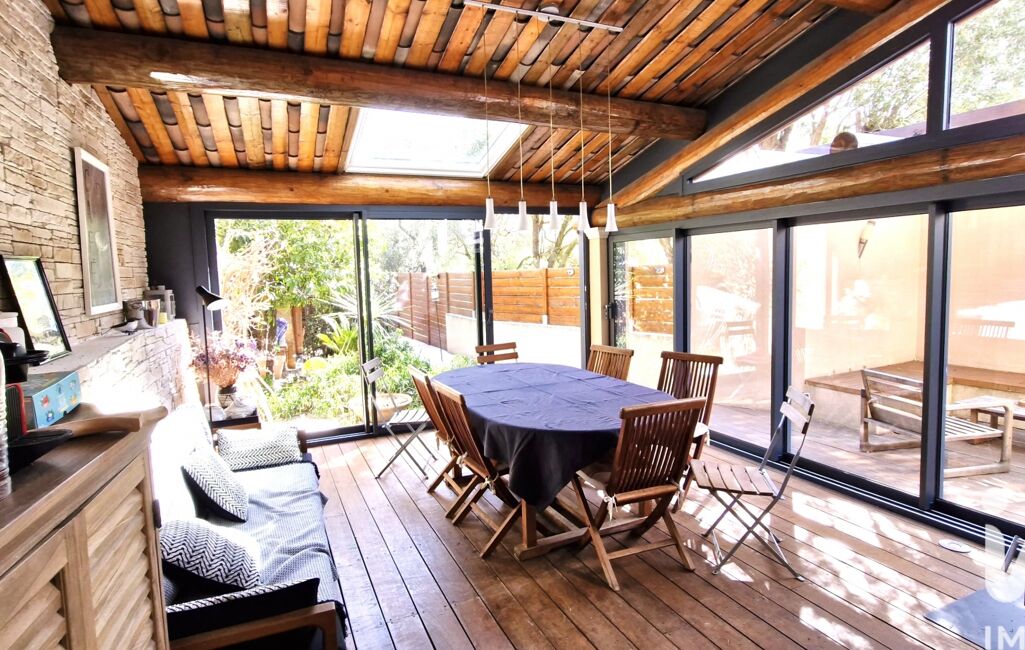 Une belle véranda de 20 m² entièrement vitrée et chauffée grâce à un poêle à bois prolonge cet espace de vie et permet de profiter de repas conviviaux tout au long de l’année.