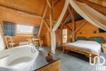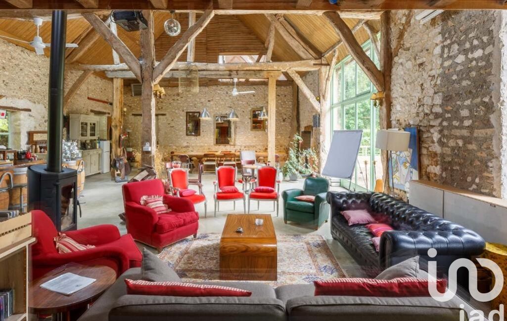 La grange déploie 427m² avec volumes spectaculaires : séjour cathédrale traversant de 144m² (8,5m de hauteur) avec ses terrasses vue parc et prairie, mezzanine de 32m², 2 suites parentales, 2 dortoirs (pour 6), cuisine professionnelle pour organiser vos réceptions, atelier, toilettes invités.