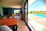 Une splendide pièce de vie d’environ 45 m², baignée de lumière grâce à de larges baies vitrées à galandage, ouvrant directement sur les terrasses et la piscine au sel.