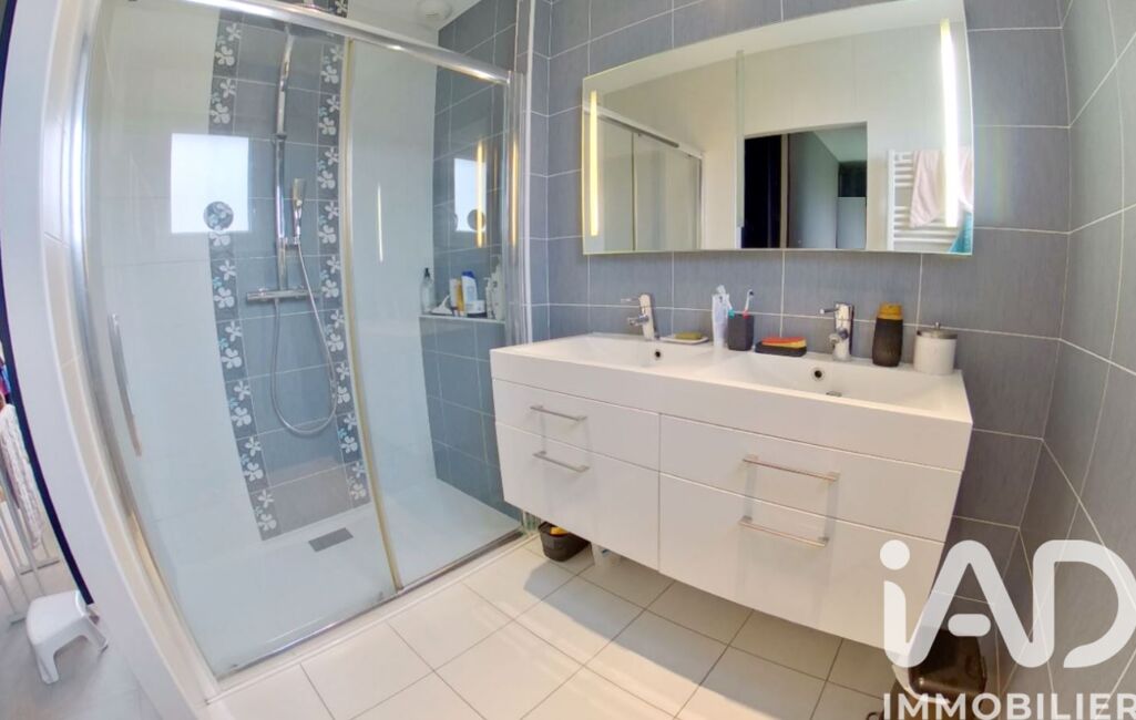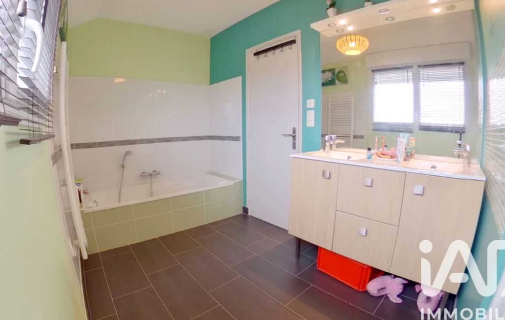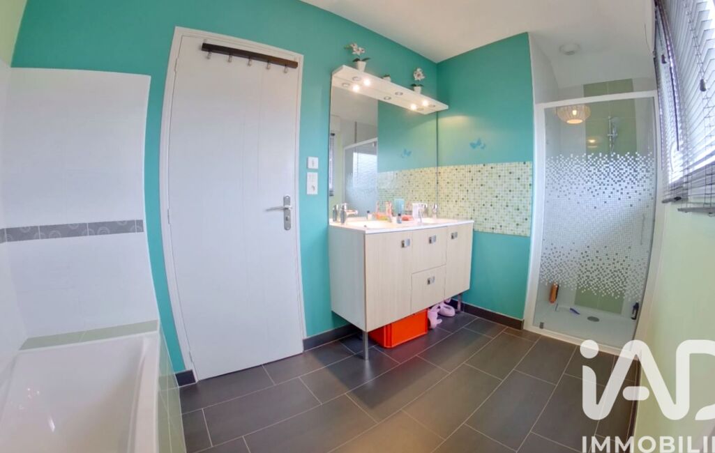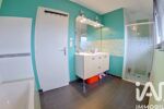 A l'étage sur 48 m² : Palier distribuant trois chambres sur parquet de 12 m² équipées de placards de rangements, d'une salle de bains de 7 m² équipée d'une baignoire, d'une douche, d'un meuble double vasque -- WC séparé --