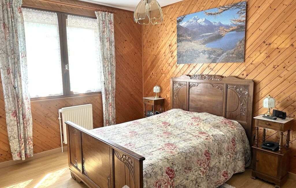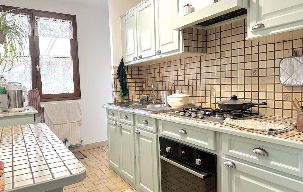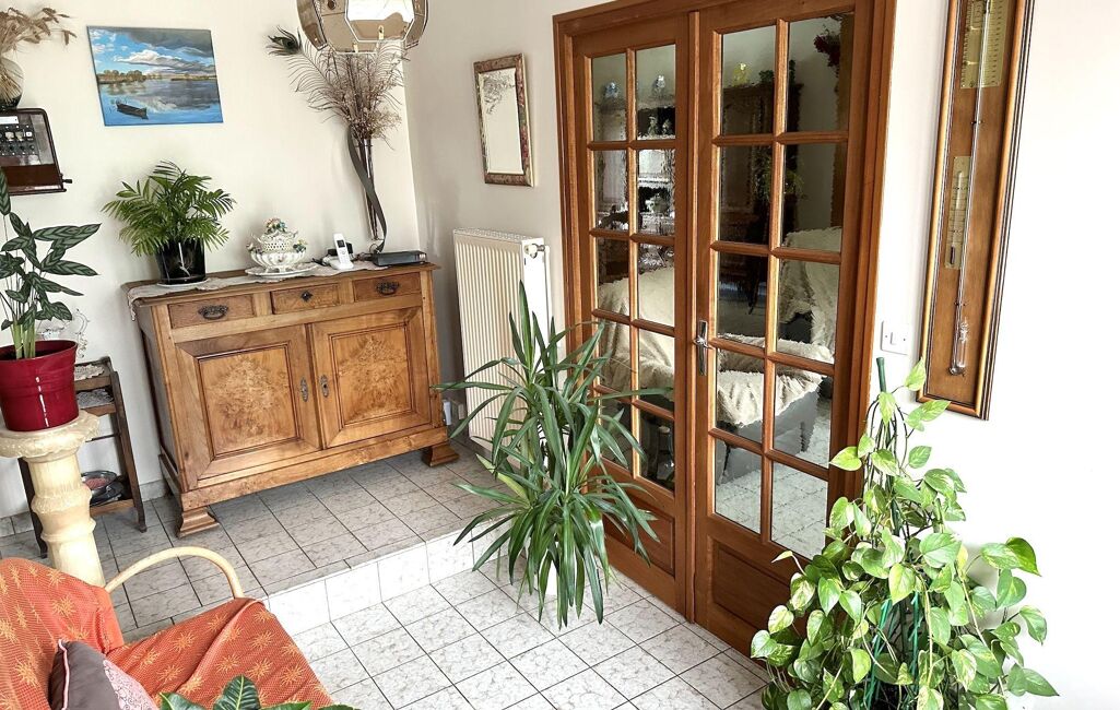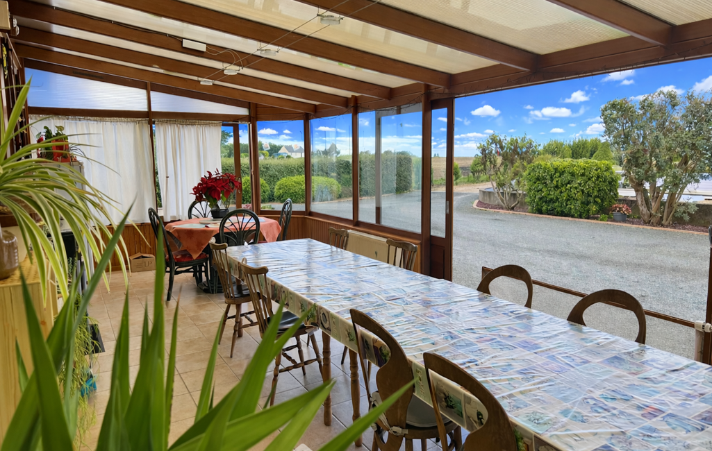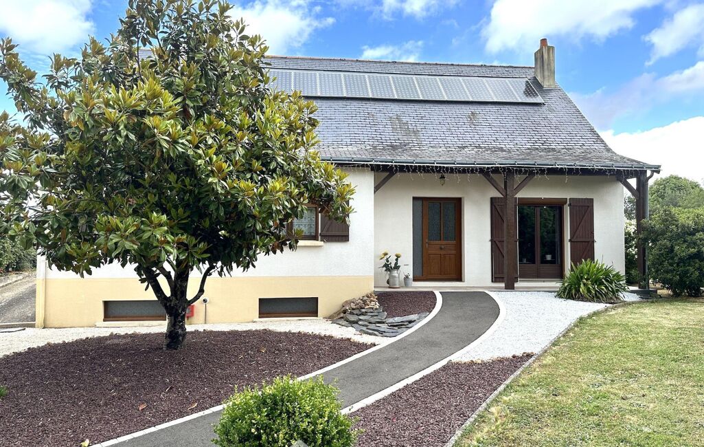 Côté prestations : chauffage au gaz complété par un insert bois dans le salon, combles isolés par soufflage de laine de roche, menuiseries bois double vitrage avec volets roulants électriques, toiture en ardoises naturelles et assainissement individuel. Des panneaux solaires sont utilisés pour la revente (revenu annuel d'environ 2000€).