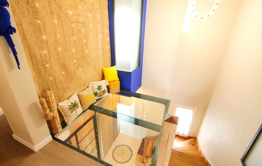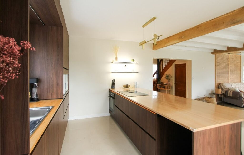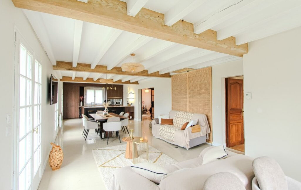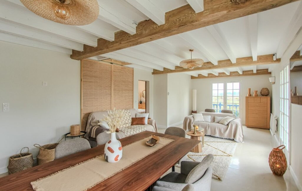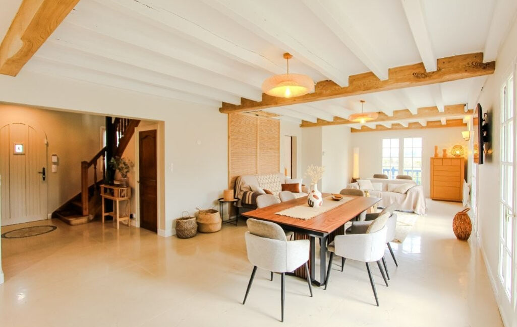 La maison se compose d'une entrée, d'un vaste espace de vie lumineux réunissant salon, salle à manger et cuisine américaine, d'un bureau, de 6 chambres, de 2 salles d'eau et de 3 WC.