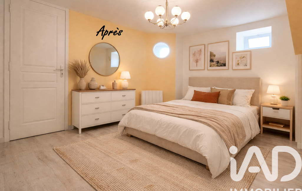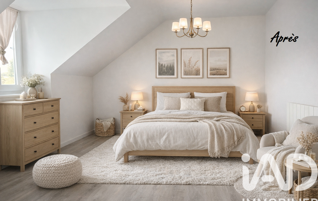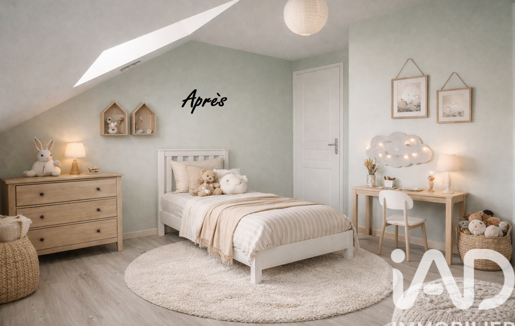 À l’étage, le palier distribue deux chambres sous rampants ainsi qu’une grande salle d’eau avec toilettes, complétant idéalement l’espace nuit.