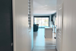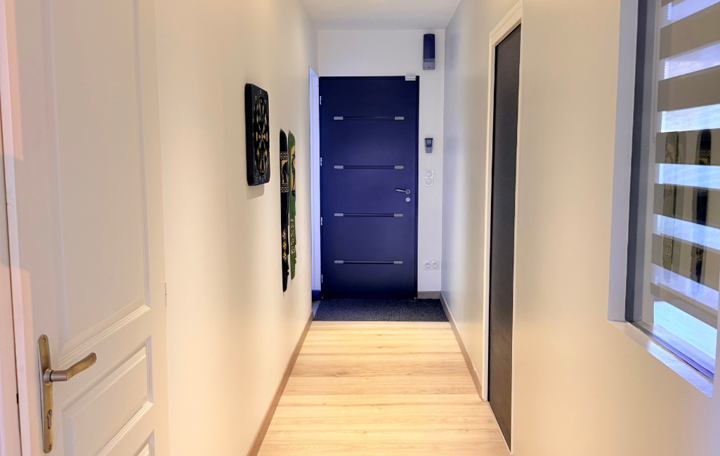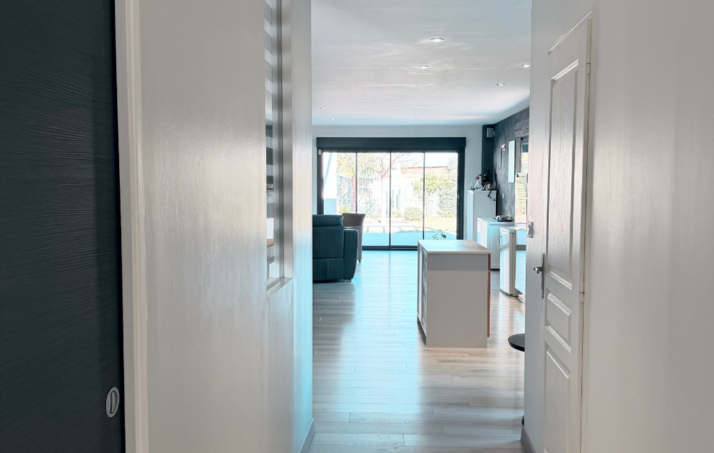 Dès l’entrée, la maison s’ouvre sur un couloir donnant immédiatement accès à une pièce de vie d’environ 64 m² comprenant salon, salle à manger et cuisine ouverte.
