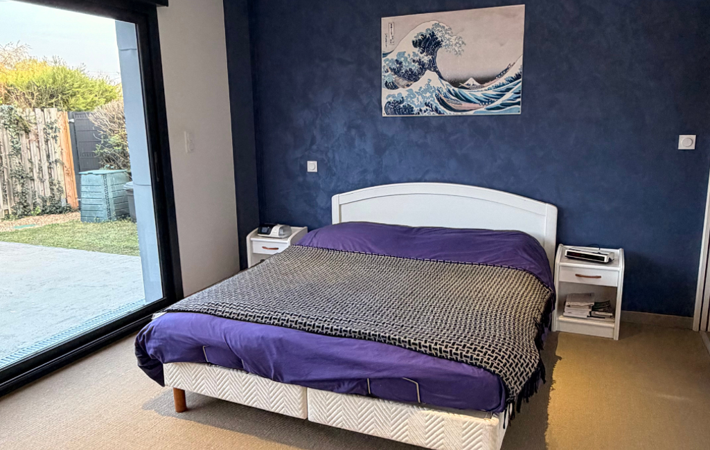 L’espace nuit se compose de trois chambres, un dressing, une salle de douche avec double vasque et d’un WC indépendant, offrant une configuration fonctionnelle et confortable, idéale pour une vie de famille ou pour ceux qui recherchent un cadre de vie pratique et agréable de plain-pied.