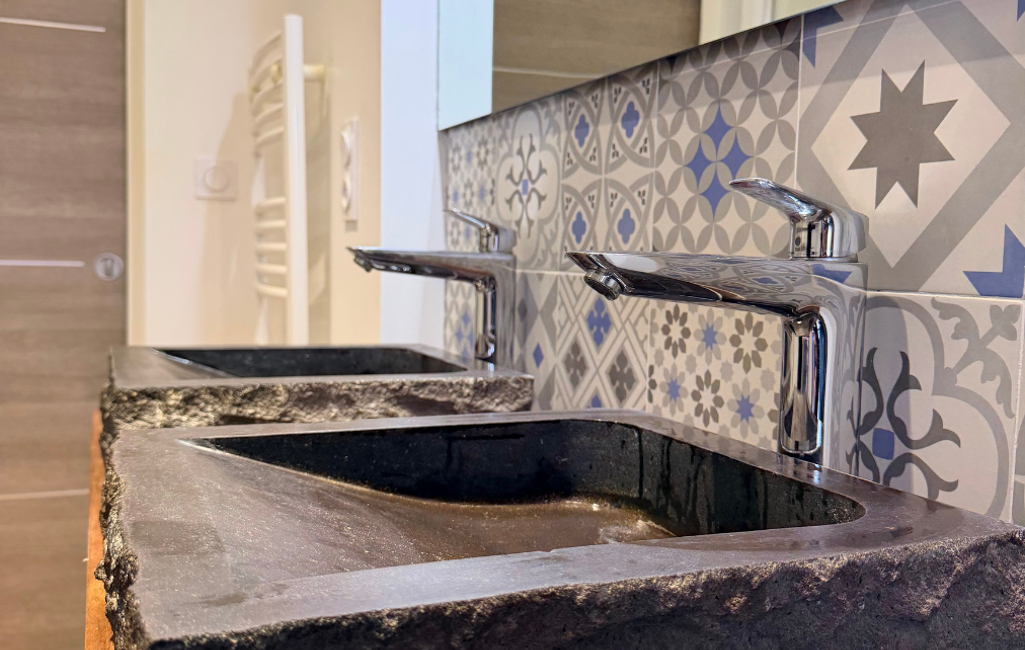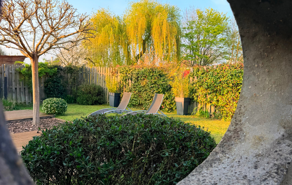 À l’extérieur, le jardin verdoyant, entièrement paysagé, a été pensé pour profiter pleinement des beaux jours, avec plusieurs terrasses permettant de suivre le soleil à différents moments de la journée.