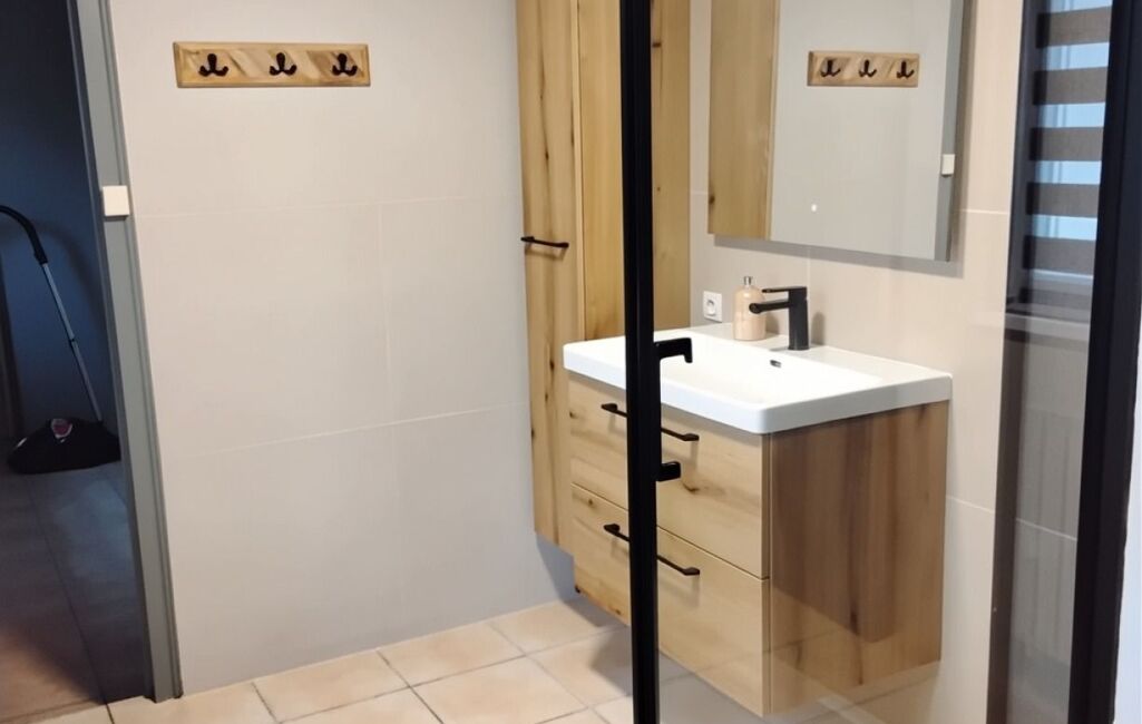 Toujours au rez-de-chaussée, de l’autre côté de la cuisine, vous trouverez un bureau de 15 m² pouvant facilement faire office de chambre. Il est suivi d’un cellier donnant accès aux toilettes ainsi qu’à une salle d’eau spacieuse, rénovée récemment.