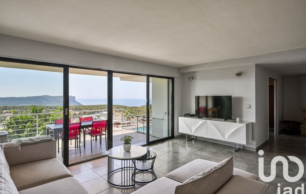 La pièce de vie de 70m² baignée de lumière et décorée avec goût, cheminée insert et climatisation gainable s'ouvre sur une large terrasse exposée sud vue mer et Cap Canaille,