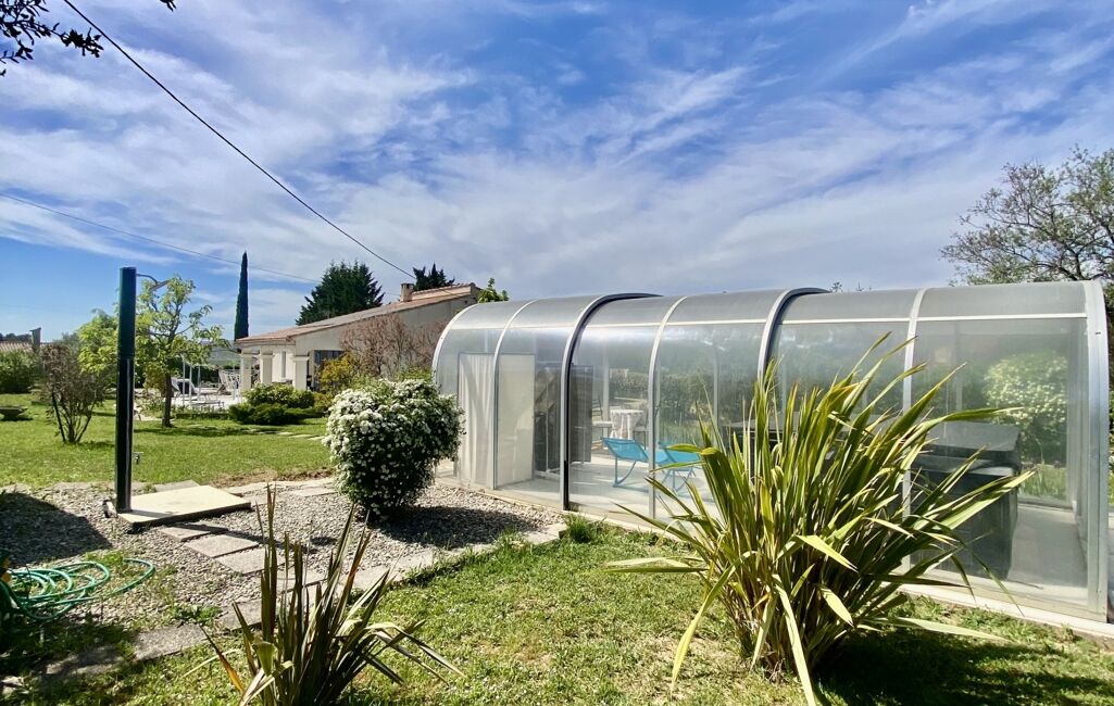Ouverte sur l'extérieur avec ses baies à galandage cette propriété bénéfice d'un environnement privilégié avec une belle exposition Sud - Est et une vue sur le Mont Aurélien. Agrémentés d'équipements récents et de qualités tel que la climatisation réversible gainable, un poêle à granulés et des panneaux photovoltaïques permettant une autoconsommation énergique totale. Un garage de 16m² et une buanderie attenante de 7m² accessible depuis la maison complète le bien ainsi qu'un grand abri de jardin.