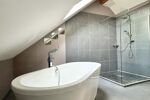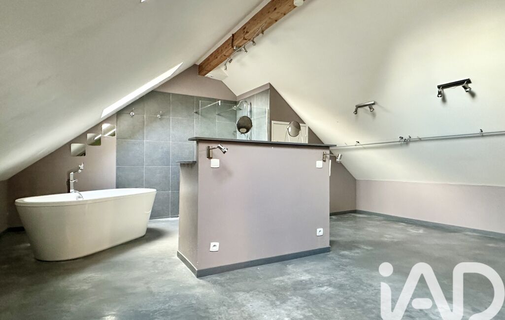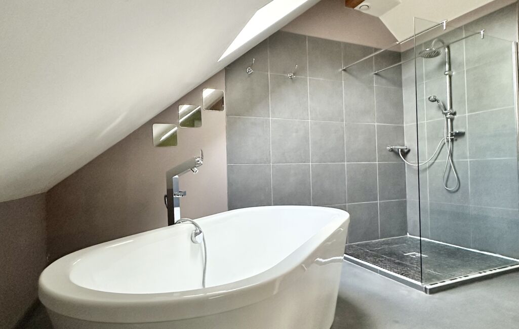Une vaste suite parentale raffinée avec sol en béton ciré, douche et baignoire, coin dressing et WC séparé