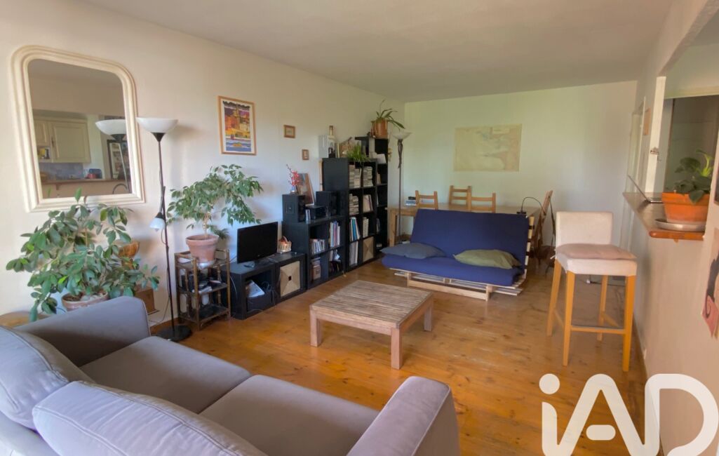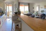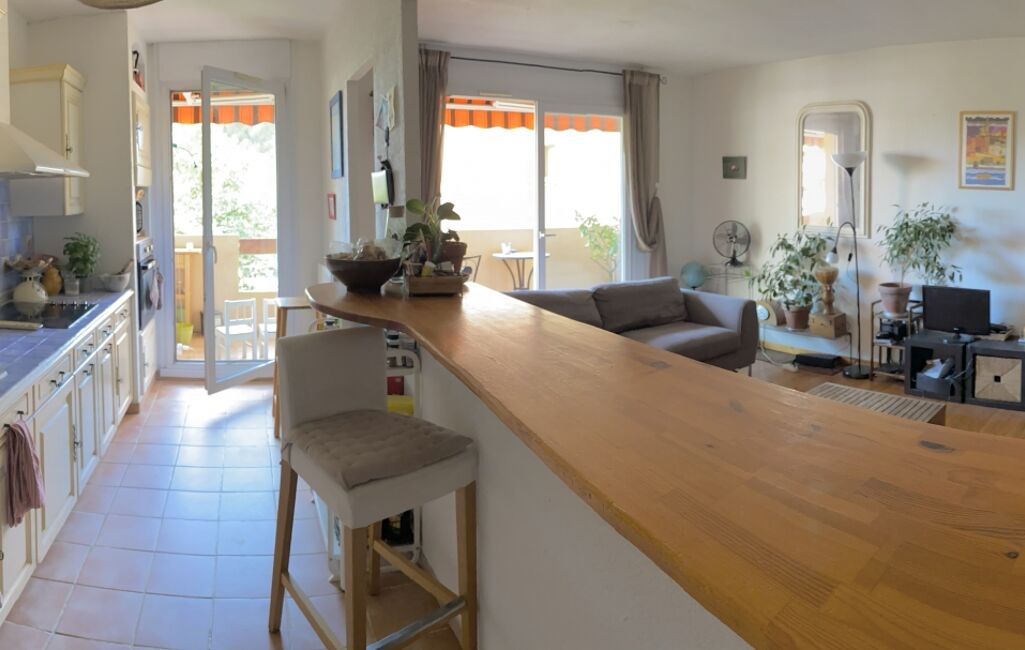 Un grand séjour ouvert sur cuisine et un premier balcon orienté au sud avec vue dégagée sur un parc arboré